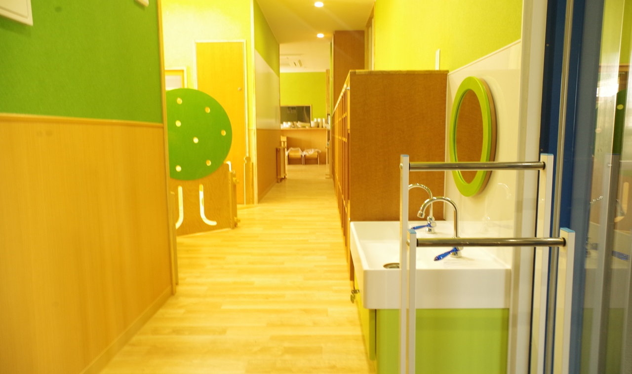 園児の目線に合わせて壁にも遊び心を加えた楽しい空間に仕上がっています