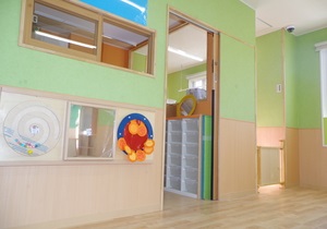 保育室は日当たりの良さもプラスされて明るい部屋になっていて、また安全面を考慮しパーテーションを設置しています